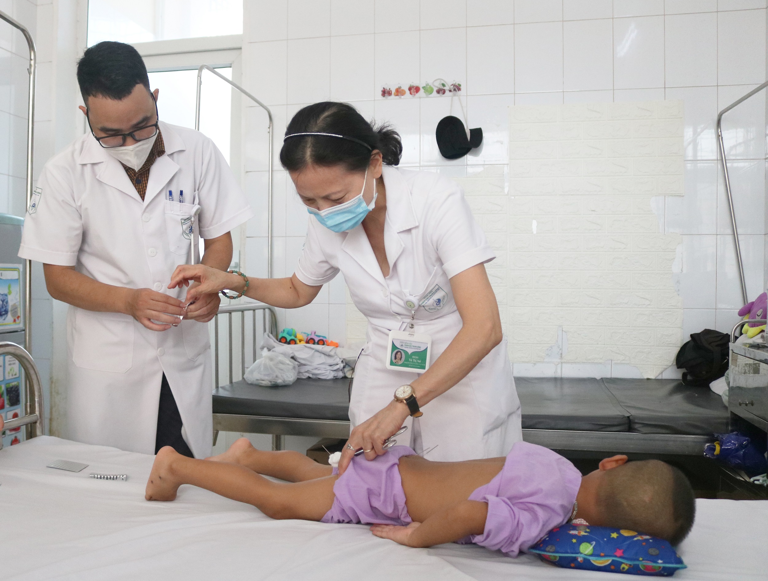 Ths.BsCKII Vũ Thị Vui- Trưởng khoa điều trị và chăm sóc trẻ bại não đang châm cứu điều trị cho trẻ bị di chứng viêm não