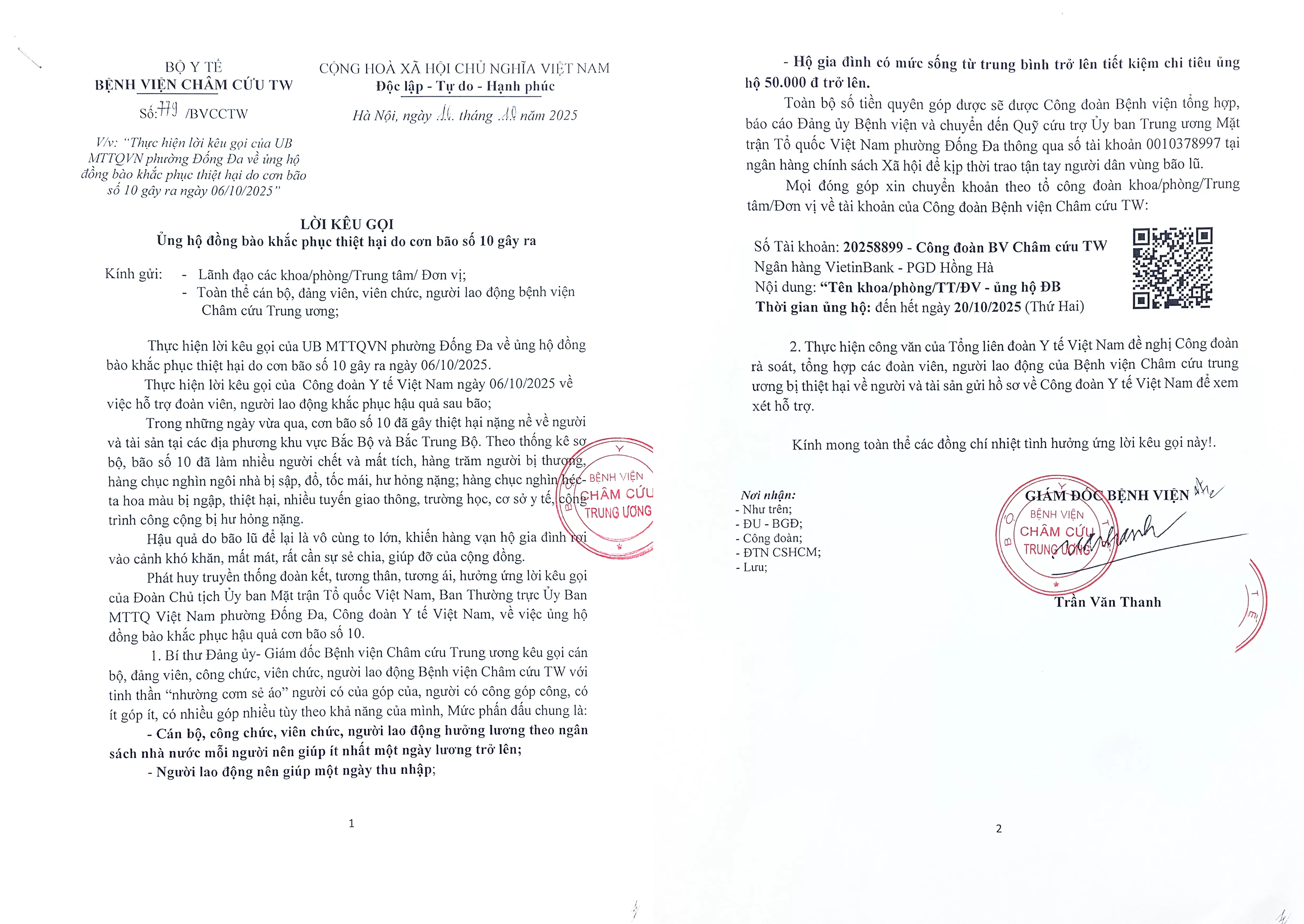 Phát huy tinh thần đoàn kết, tương thân, tương ái, hưởng ứng lời kêu gọi của UB MTTQVN phường Đống Đa về ủng hộ đồng bào khắc phục thiệt hại do cơn bão số 10 gây ra ngày 06/10/2025, đồng thời thực hiện lời kêu gọi của Công đoàn Y tế Việt Nam việc hỗ trợ đoàn viên, người lao động khắc phục hậu quả sau bão. Sáng ngày 20/10/2025, Đảng ủy – Ban Giám đốc Bệnh viện Châm cứu Trung ương cùng Công đoàn Bệnh viện, đã tổ chức “Lễ phát động ủng hộ đồng bào khắc phục thiệt hại do cơn bão số 10 gây ra”. Chương trình có sự tham gia của lãnh đạo các khoa, phòng, trung tâm, đơn vị trong bệnh viện, đại diện cho tập thể cán bộ, công nhân viên y tế Bệnh viện Châm cứu Trung ương.