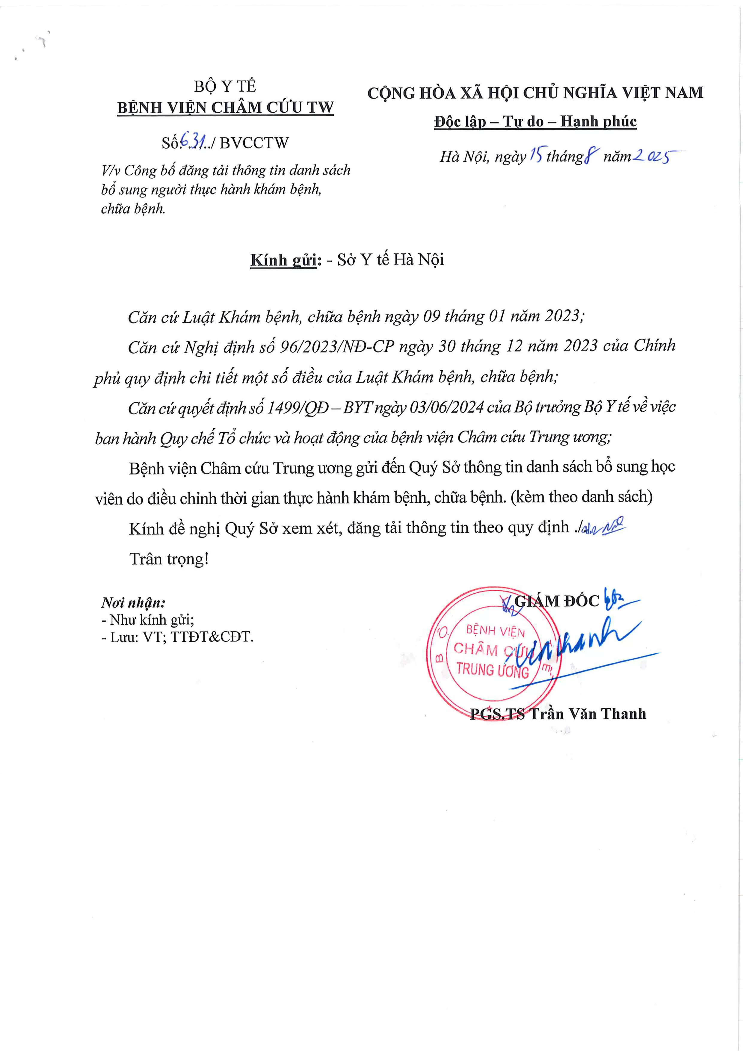 THÔNG BÁO; Bệnh viện Châm cứu Trung ương công bố thông tin danh sách bổ sung người thực hành khám bệnh, chữa bệnh